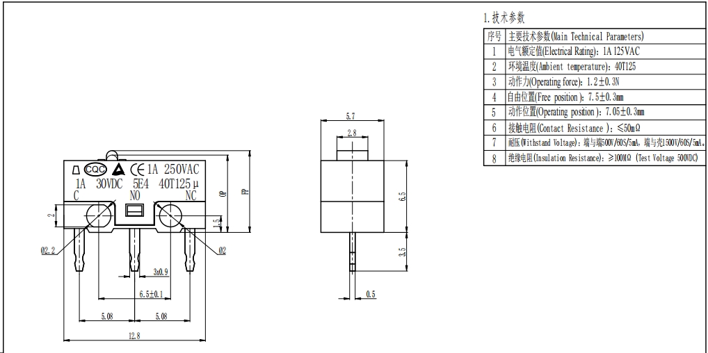 Kasutades patenteeritud kiirkäivitusmehhanismi, on päästiku reaktsiooniaeg ≤8 ms, mis parandab jõudlust 25% võrreldes traditsiooniliste mikrolülititega. Päästiku käik on täpselt juhitav vahemikus 0,3–1,0 mm, tööjõu vahemikuga 1,5–4 N. Vajutustagasiside on selge ja terav, ilma kleepumise või vaba mänguta, võimaldades täpset juhtimist „ühendamiseks kerge puudutusega, katkestamiseks vabastamisega”, mis sobib suurepäraselt stsenaariumide jaoks, mis nõuavad suurt päästiku tundlikkust. Kontaktid on valmistatud kõrge puhtusastmega hõbe-tina sulamist ja töödeldud täpse punktkeevitusega, mille esialgne kontakttakistus on ≤30mΩ. Nimikoormus toetab 1A/250V vahelduvvoolu ja 3A/125V vahelduvvoolu, vältides tõhusalt kontakti kuumenemist või põlemist voolu läbimisel.